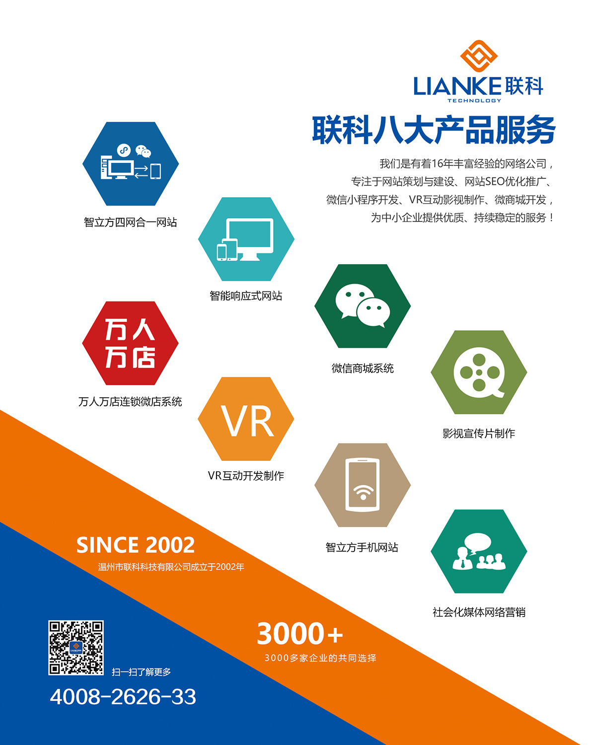 溫州市聯(lián)科科技有限公司成立于2002年,從業(yè)16年以來(lái)專注于互聯(lián)網(wǎng)技術(shù)服務(wù),致力于為中國(guó)的成長(zhǎng)型企業(yè)提供電子商務(wù)整體解決方案,為3000多家中小微企業(yè)提供互聯(lián)網(wǎng)基礎(chǔ)服務(wù)、網(wǎng)站建設(shè)、微信小程序開(kāi)發(fā)、網(wǎng)絡(luò)營(yíng)銷(xiāo)推廣、電子商務(wù)平臺(tái)系統(tǒng)開(kāi)發(fā)等服務(wù)。時(shí)代在不斷變化,新技術(shù)窮出不盡,互聯(lián)網(wǎng)對(duì)企業(yè)的用途,從原來(lái)的網(wǎng)站建設(shè)、網(wǎng)絡(luò)營(yíng)銷(xiāo)推廣到電子商務(wù)平臺(tái)交易,從PC互聯(lián)網(wǎng)到移動(dòng)互聯(lián)網(wǎng),都在不斷迭代升級(jí)。做為一家互聯(lián)網(wǎng)第三方技術(shù)服務(wù)公司,聯(lián)科一直把技術(shù)創(chuàng)新做為公司發(fā)展的重要任務(wù)去抓,不斷推出適應(yīng)企業(yè)發(fā)展的新技術(shù)、新產(chǎn)品、新服務(wù),包括四網(wǎng)合一網(wǎng)站系統(tǒng)、響應(yīng)式網(wǎng)站系統(tǒng)、智立方SEO推廣系統(tǒng)、微信分銷(xiāo)商城系統(tǒng)、萬(wàn)人萬(wàn)店連鎖微店系統(tǒng)等。