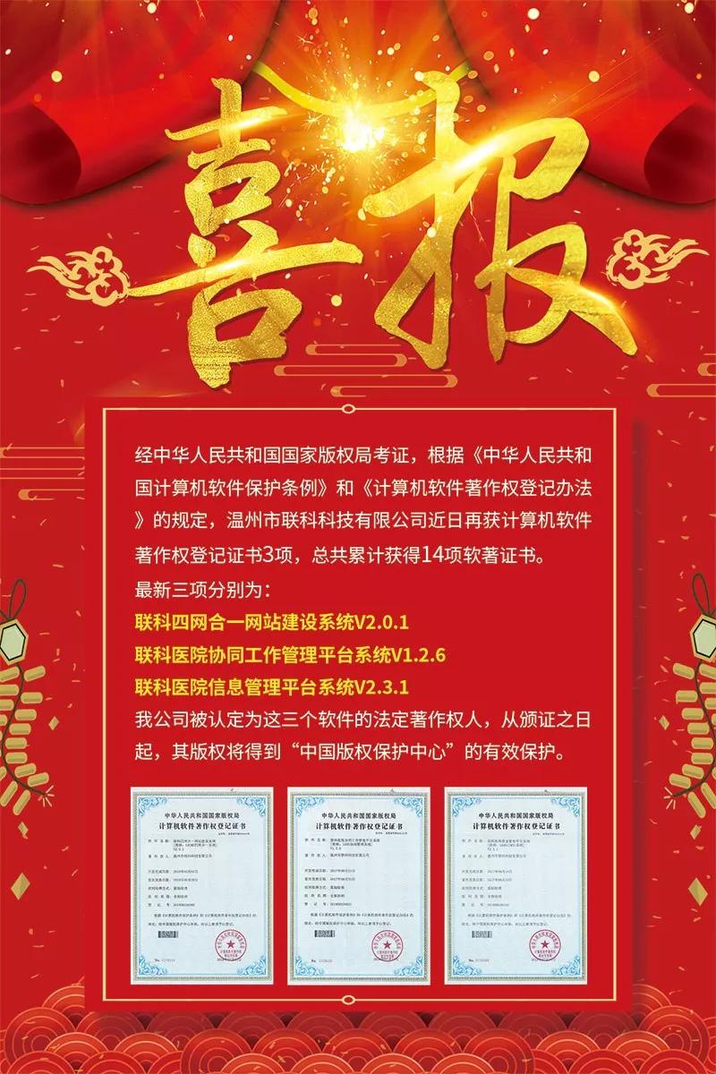《聯(lián)科醫(yī)院協(xié)同工作管理平臺(tái)系統(tǒng)V1.2.6》于2018年07月11日被正式授予《中華人民共和國國家版權(quán)局計(jì)算機(jī)軟件著作權(quán)登記證書》,登記號(hào)為2018SR539031。