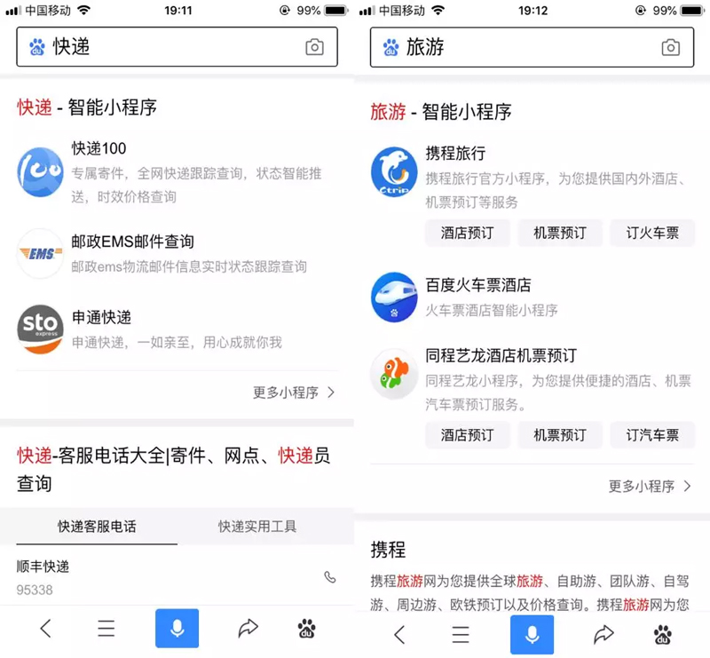泛詞聚合卡片示例:當(dāng)用戶搜索“快遞”時,搜索結(jié)果中會匹配出“快遞100、郵政EMS郵件查詢”等3個相關(guān)智能小程序。點擊下方的“更多小程序”,可以查看與“快遞”或“旅游“相關(guān)的全部智能小程序。