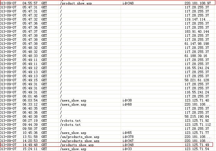 請(qǐng)看以上紅筆圈出的部分,同樣頁(yè)面一天內(nèi)爬行了兩次,兩個(gè)IP分別是220.181.108.97和123.125.71.49可以很容易看出來(lái)這2個(gè)IP一個(gè)是提權(quán)的蜘蛛,一個(gè)是垃圾內(nèi)容的蜘蛛。在同一天爬行了你的網(wǎng)站,對(duì)于網(wǎng)上那些說(shuō)隔天收錄的親們,我會(huì)告訴你,我今天在百度輸入
