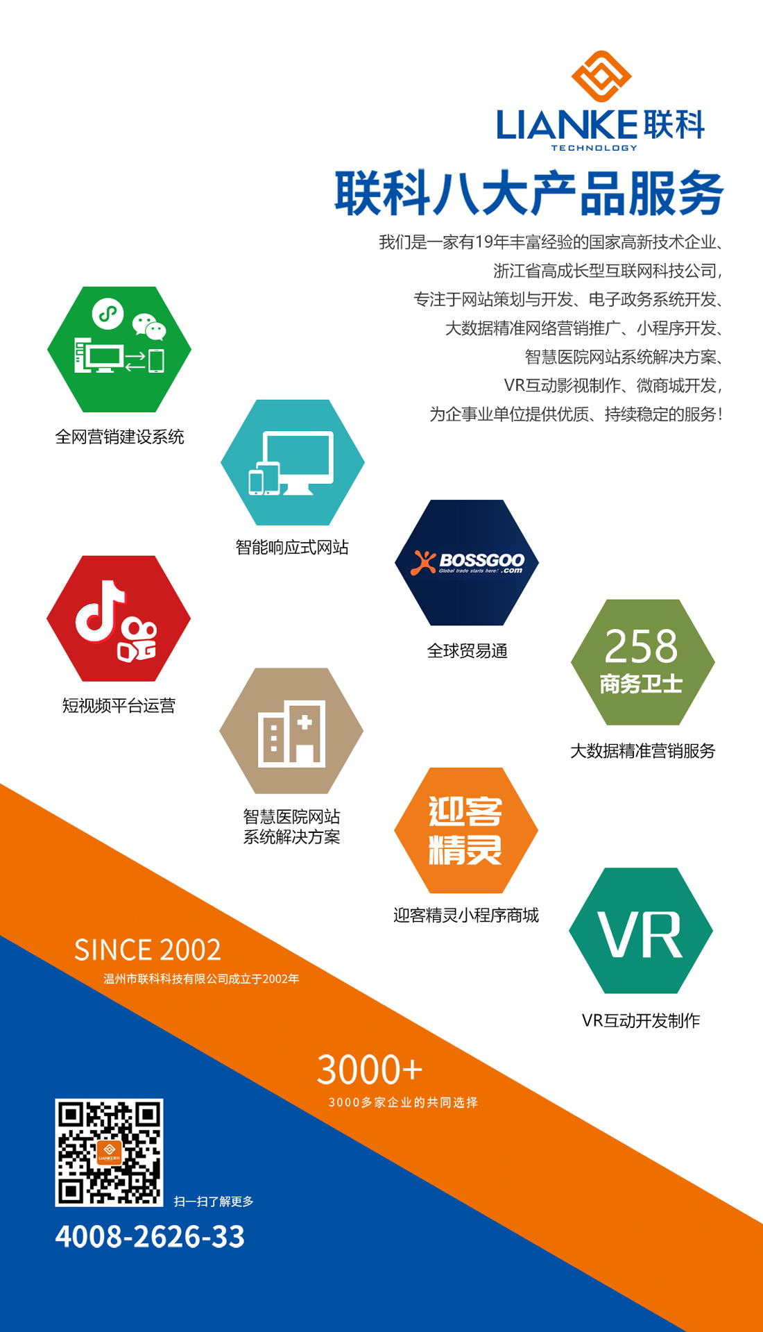 溫州市聯(lián)科科技有限公司成立于2002年,3000多家企業(yè)的共同選擇,致力于為中國的成長型企業(yè)提供電子商務(wù)整體解決方案。從網(wǎng)站建設(shè)開發(fā)、微信小程序開發(fā)、網(wǎng)絡(luò)購物商城系統(tǒng)開發(fā)、智慧醫(yī)院網(wǎng)站系統(tǒng)解決方案、移動電商連鎖開店平臺開發(fā)到網(wǎng)絡(luò)營銷整合服務(wù),始終圍繞企業(yè)發(fā)展過程中對銷售力提升的需求,進(jìn)行持續(xù)的服務(wù)創(chuàng)新和產(chǎn)品研發(fā)。