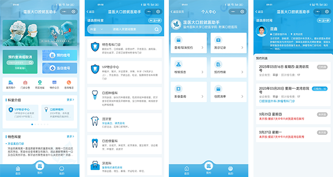 為溫醫(yī)大附屬口腔醫(yī)院開發(fā)的微信小程序應(yīng)用,根據(jù)需求進(jìn)行整體UI設(shè)計,呈現(xiàn)更好地視覺效果,優(yōu)化患者預(yù)約、查詢等功能的用戶體驗(yàn)。包括預(yù)約掛號、當(dāng)日掛號、科室介紹、物價公示、專家介紹、查詢就診記錄、體檢報告、醫(yī)療影像、住院清單等功能,助力醫(yī)院更好服務(wù)患者。